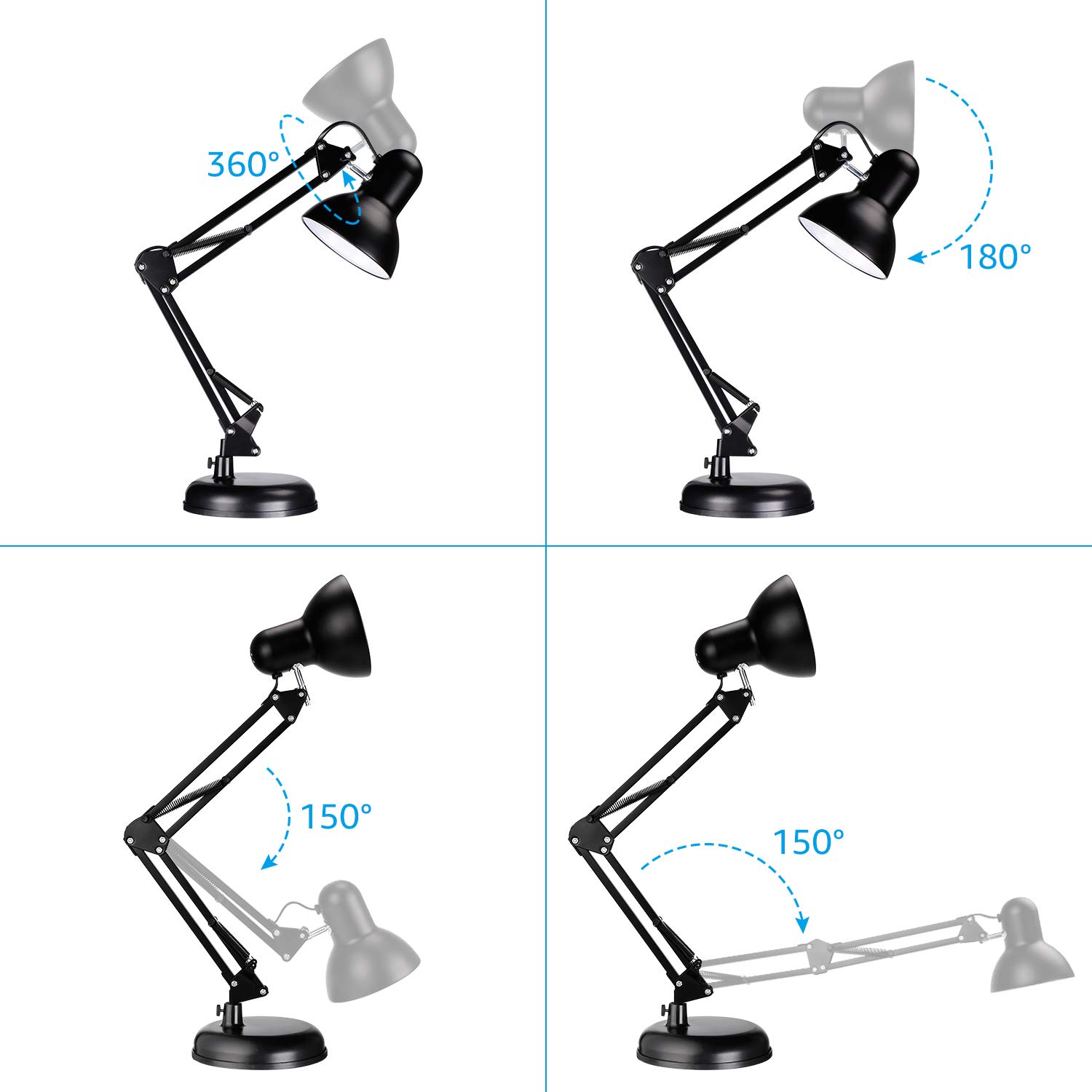 Dual arm desk lamp adjustable with bell shaped shade. A 60 w bulb is needed for this table lamp (not included). The durable, steel black shade blends with any design style.