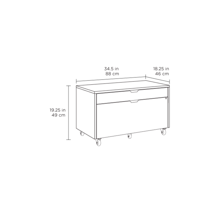 The unique platform desk stands securely on a black steel trestle base and features an open storage shelf flanked with two storage drawers.