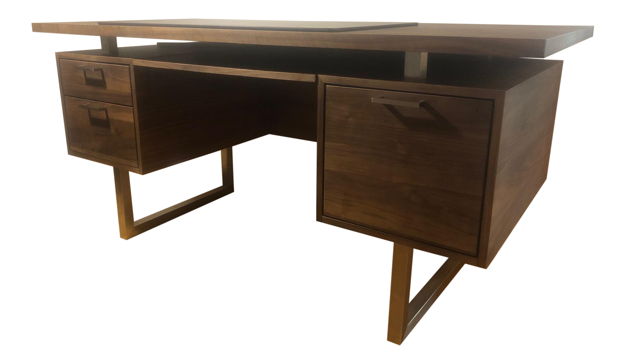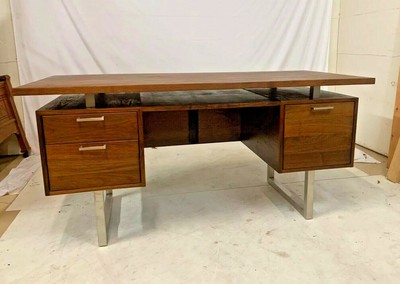 Italian modern walnut and brass executive desk, gio ponti. Handcrafted in pennsylvania, the clybourn desk's solid american walnut top floats on brushed stainless steel supports for a striking, architectural look that conceals a functional designed and tested for use in commercial spaces the clybourn executive desk is a crate and barrel exclusive. The multifunction center drawer provides the ideal space for a keyboard, mouse and rechargeable items like cell phones and music players. Walnut curved executive cantilever office desk.