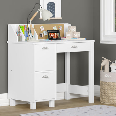 The desk has two file drawers to the left, one drawer, and a cabinet with adjustable shelf and slide out.