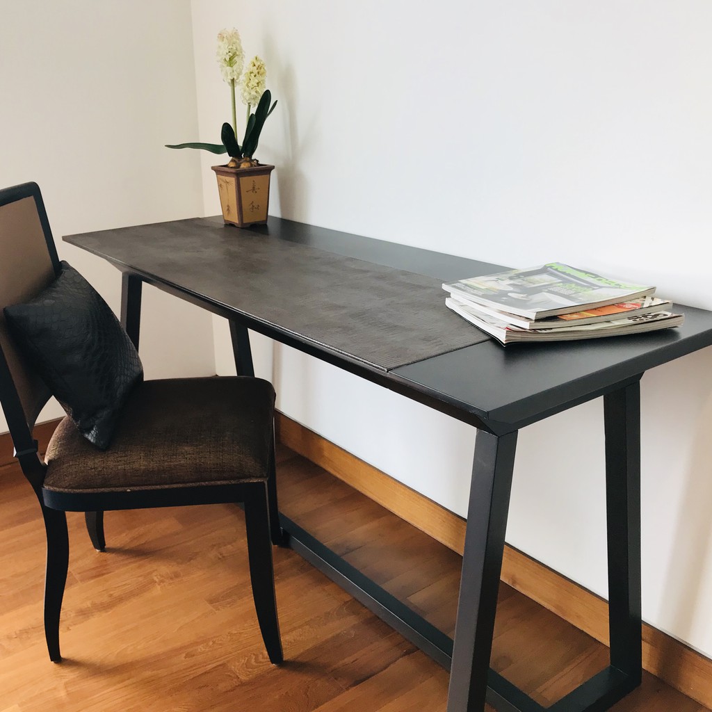 Simple desk design that is easy to replicate. Create a custom desk for your office or a custom computer desk for your study. Material in full 15mm particle board with metal frame. Personalize your study area with custom wall artwork.