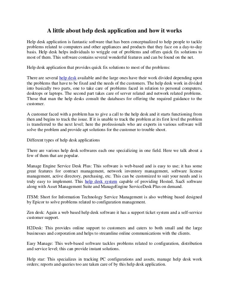 Our help desk training will help you perform desktop or it support, and triage and solve issues in record time. A help desk might be considered as offering a subset of service desk capabilities by some, or be of course, features like knowledge management and reporting are critical in a service desk solution, but you'll also want a service desk that's easy to use and set up, enables. And whether they've found a bug, need help getting their account set up, or messed something up themselves doesn't really matter. Some help desk interview questions pose specific scenarios, testing how well you respond to them in the moment.
